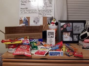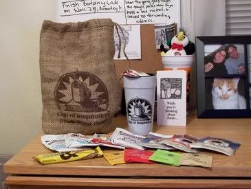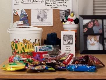 Then later, after I came back to my room (I live in suite-style dorms w/ 3 sweet girls) and am winding down by knitting, I hear the doorbell ring. Not knowing if anyone else is here I come out of my room, and Nancy is at the door. Three girls loaded with boxes and bags are standing there, asking if she is Casey. Of course, she says no, and I say "I'm Casey." They say they have a delivery for me and hand me a bucket, a bag, and a box and make me sign off on some paperwork. My parents have sent me a "Dead Week/Finals Survival Kit" and all three containers where just packed full of stuff like candy, chips, gum, cocoa, coffee, tea, toys...well, you get the idea.